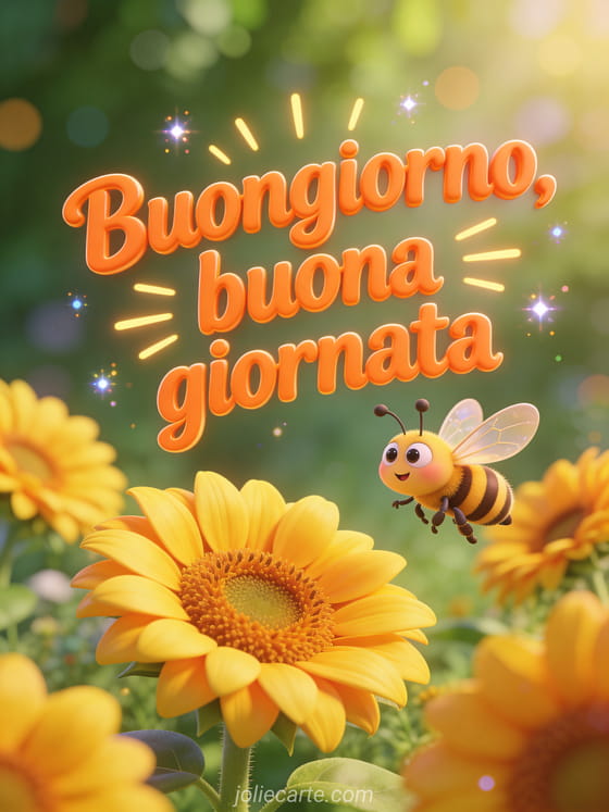 Condividi buongiorno buona domenica e buona giornata con scritte arancioni allegre, raggi di sole, una graziosa ape in stile cartone che ronza tra girasoli gialli e una scena di giardino estivo. Scopri anche buongiorno buona domenica e buona giornata o buona domenica fredda immagini.