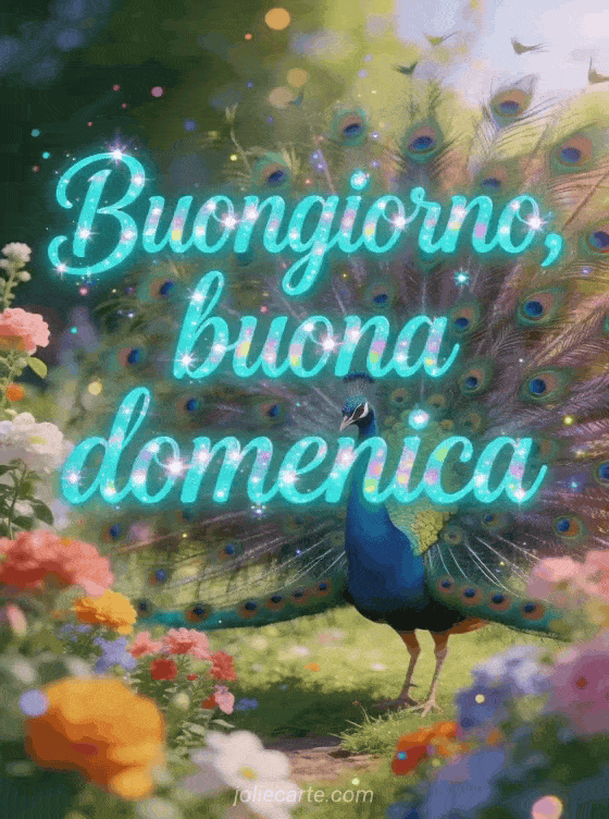 Augura una domenica splendente con questo biglietto colorato che mostra un magnifico pavone mentre apre la sua coda in un giardino pieno di fiori. Scopri anche buona domenica pioggia, buona domenica immagine gratis o domenica benedetta.