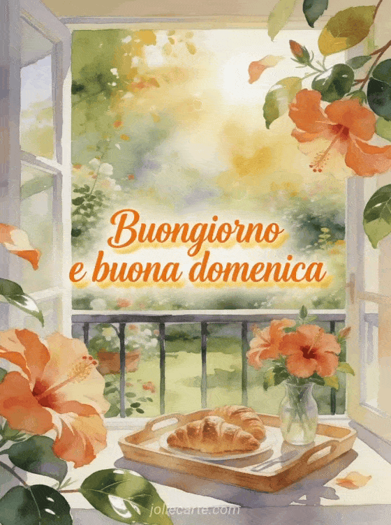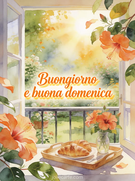 Invia un messaggio luminoso della domenica mattina con croissant, fiori di ibisco e vista sul giardino da un balcone ad acquerello. Scopri anche buona domenica immagini con fiori, un messaggio per dire buona domenica o una buona domenica immagine gratis.
