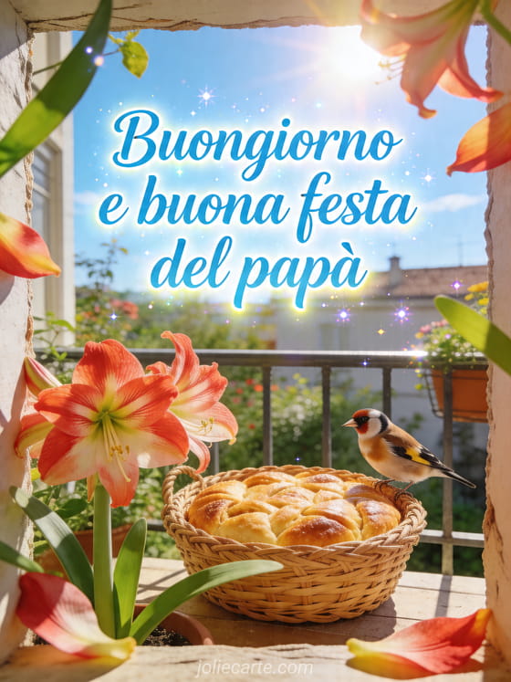 Invia un augurio radioso di buongiorno e buona festa del papĂ con un giardino sul balcone pieno di amarilli, luce del mattino e un fringuello posato. Scopri anche un biglietto camicia per la Festa del PapĂ o un biglietto per la festa del papĂ .