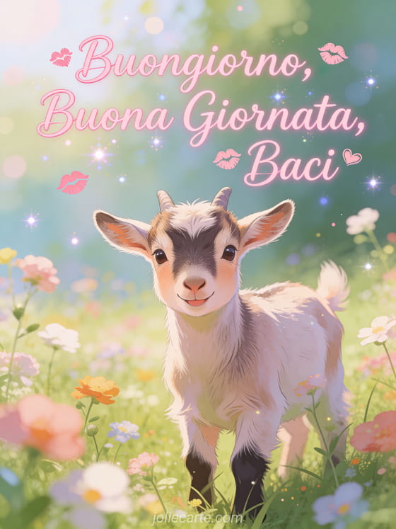 Inizia la giornata con amore con questo dolce biglietto che presenta un adorabile caprettino nano in un prato fiorito con un'espressione giocosa e innocente, in una scena pastorale primaverile piena di fascino campestre. Scopri anche un buona giornata anche a te baci o un buona giornata baci gif.
