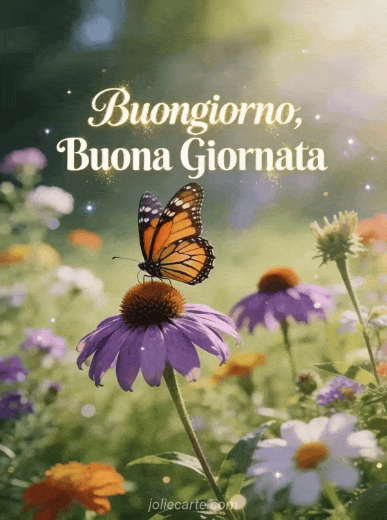 Condividi un saluto di buongiorno e buona giornata con questa bellissima cartolina di farfalla monarca nel giardino. Scopri anche sole buona giornata o messaggio buongiorno buona giornata.