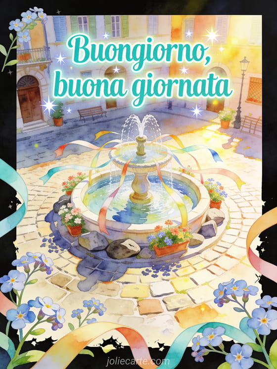 Condividi buongiorno, buona giornata con una fontana di piazza luminosa ad acquerello, nastri svolazzanti, fiori di aubrieta e ciottoli illuminati dal sole. Puoi inviare anche una buona giornata anche gif, una buona giornata fata gif o una buona giornata baci gif animata.
