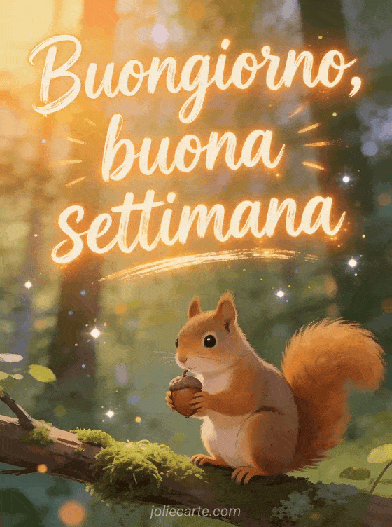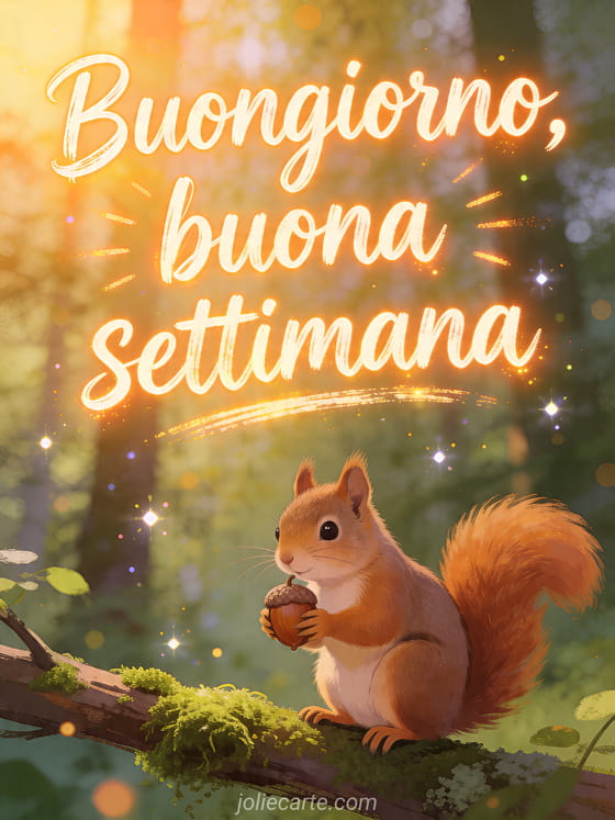 Buongiorno, buona settimana un augurio fresco per la settimana con un carino scoiattolo nella foresta