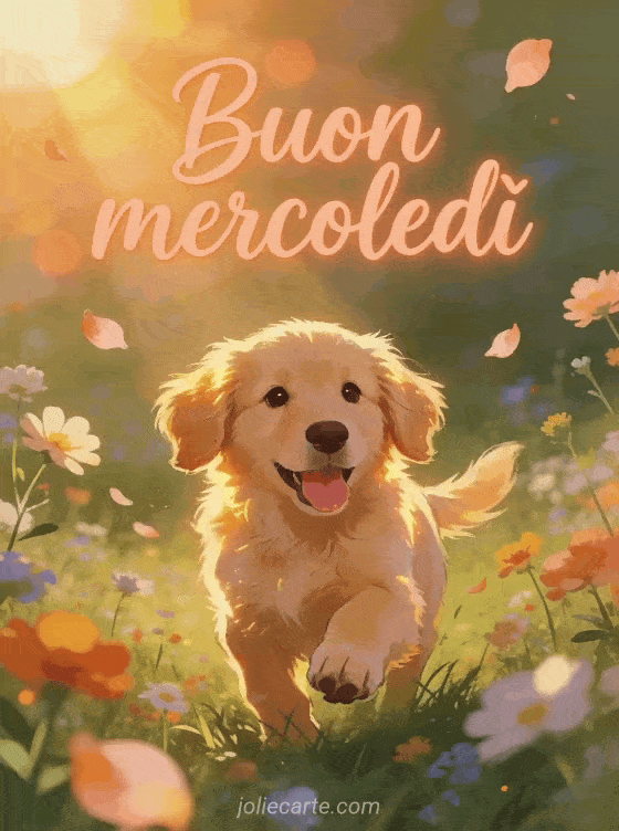 Invia un augurio gioioso di buon mercoledì con un soffice cucciolo di golden retriever che gioca in un prato di fiori selvatici all'alba. Scopri anche buon mercoledì foto, buon mercoledì bouquet o buon mercoledì baci gif animata.