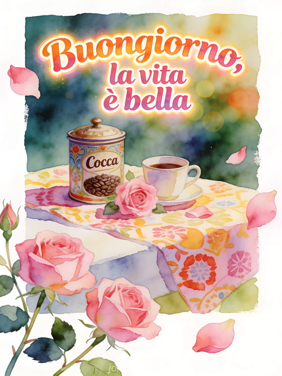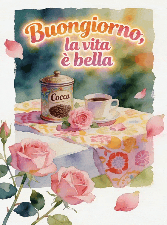 Condividi un promemoria luminoso del mattino: la vita è bella, con un barattolo da caffè decorativo, una tazza e rose rosa su un tessuto allegro a motivi. Puoi inviare anche gif buongiorno caffè, buongiorno caffè tenerezza o buongiorno caffè citazione.