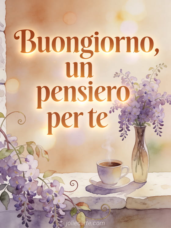 Condividi un pensiero gentile per qualcuno con questo biglietto ad acquerello, con un vaso sottile di glicine, foglie arricciate e una tazza di caffè fumante su pietra chiara. Scopri anche immagine buongiorno caffè, buongiorno con caffè gif animata o buongiorno buon caffè gif.