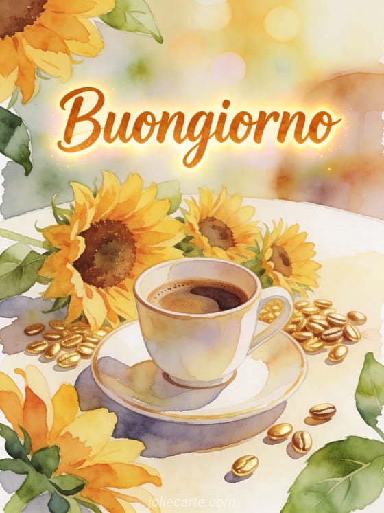 Condividi buongiorno con lettere caramello, una tazzina espresso su un piattino, girasoli e chicchi di caffè dorati su un tavolo da colazione luminoso. Scopri anche carina immagine buongiorno caffè, buongiorno buon caffè del mattino o bella immagine buongiorno caffè.