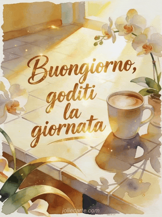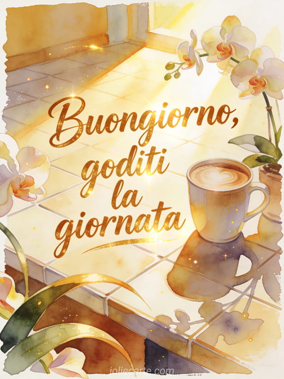 Condividi il calore soleggiato del mattino con una tazza di cappuccino accanto a orchidee in un raggio brillante di sole su un tavolo piastrellato. Puoi inviare anche caffè caldo caffè buongiorno con alba, buongiorno e buon caffè immagine o buongiorno caffè gif caffè.