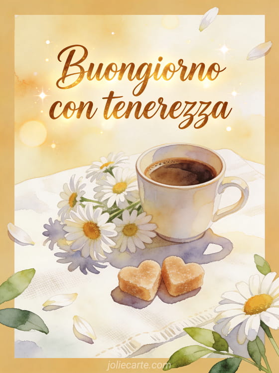 Condividi un dolce augurio del mattino con scritta castagna ad acquerello, una tazza di caffè, margherite, zollette di zucchero a forma di cuore, lino chiaro e bokeh scintillante. Scopri anche un biglietto buongiorno caffè citazione, un biglietto gif scintillante buongiorno caffè o un biglietto caffè buongiorno mia cara.
