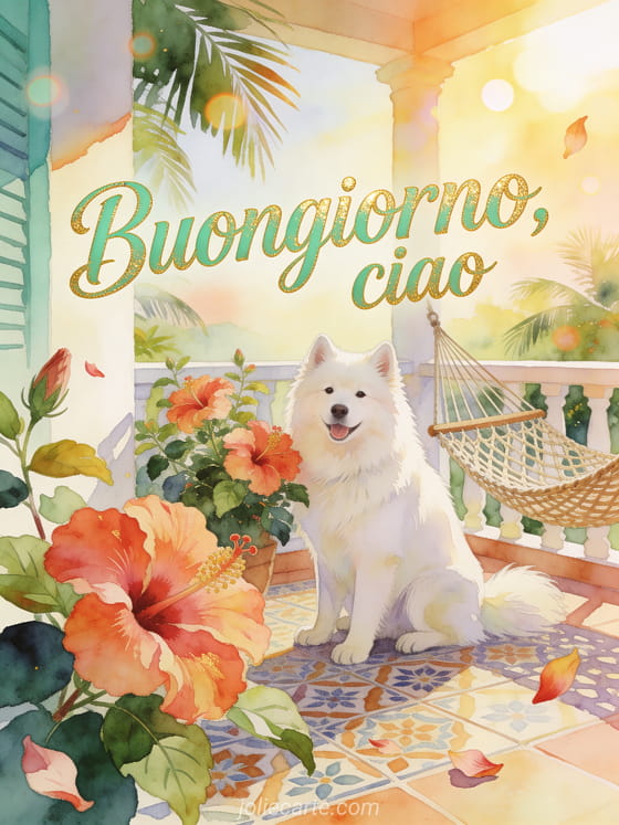 Invia buongiorno ciao gif con scritte verde menta in acquerello, un cane Samoiedo accanto a fiori di ibisco, piastrelle decorate, un'amaca intrecciata e luce calda dell'alba su una terrazza tropicale. Puoi anche condividere una cartolina di ciao baci gif carina, una cartolina di buona giornata ciao buongiorno gif o una cartolina di ciao buongiorno gif.