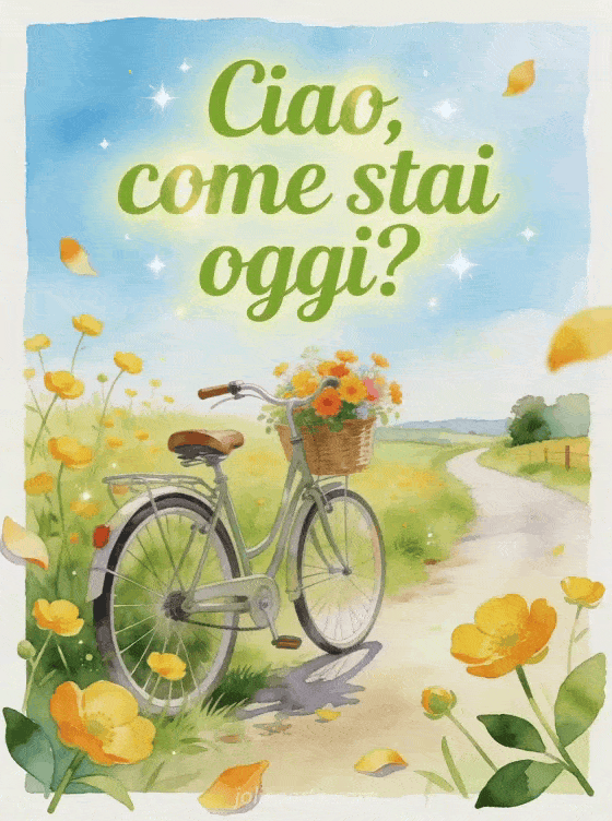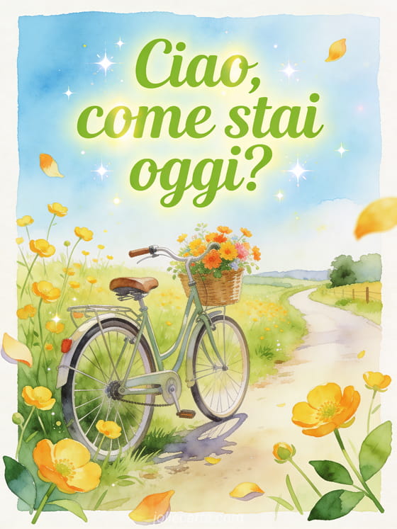 Invia un pensiero luminoso con scritte verdi ad acquerello, ranuncoli, una bicicletta vintage con cestino di fiori, luce fresca e un sentiero di campagna. Scopri anche un biglietto buonasera tesoro mio come stai, un biglietto ciao come stai oggi o un biglietto stai bene amore mio.