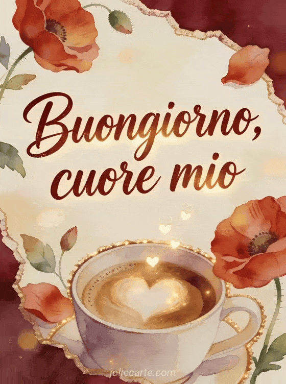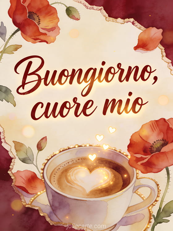 Condividi un momento amorevole del mattino con questo biglietto ad acquerello, con una tazza di caffè con schiuma a forma di cuore, petali di papavero, foglie e piccoli cuori luminosi. Scopri anche buongiorno caffè caffè, gif buongiorno caffè o buongiorno caffè tenerezza.