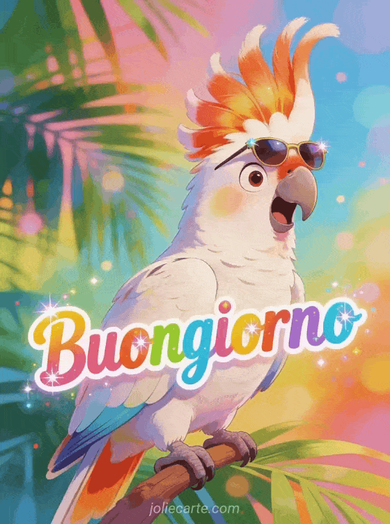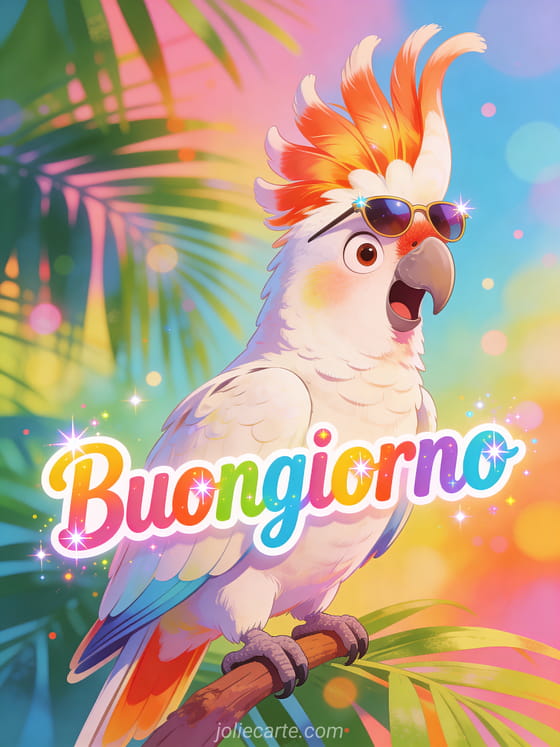 Condividi un saluto divertente di buongiorno con scritta colorata giocosa, scintille e un cacatua buffo con espressione sorpresa che indossa piccoli occhiali da sole tra foglie di palma tropicali. Scopri anche un biglietto buongiorno venerdì paesaggio, un biglietto buon venerdì buon fine settimana umorismo o un messaggio per augurare buon venerdì ai musulmani.
