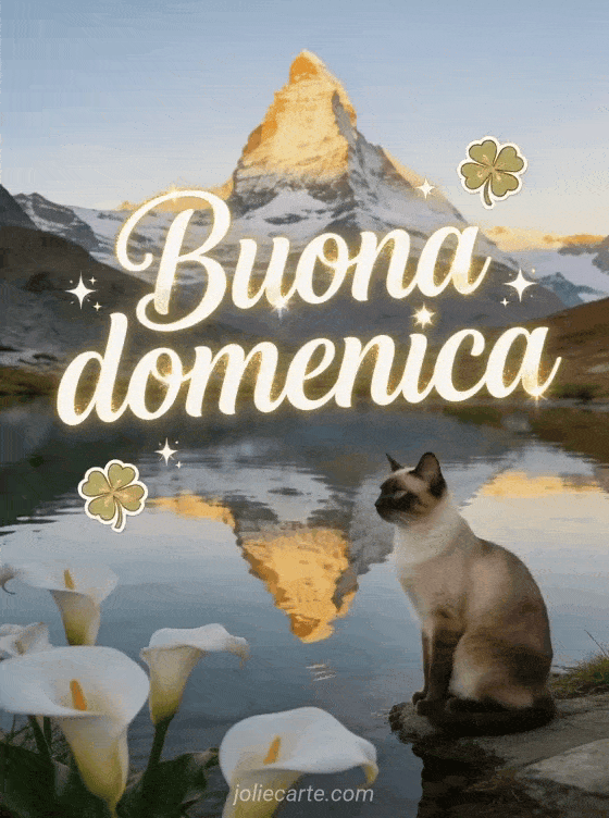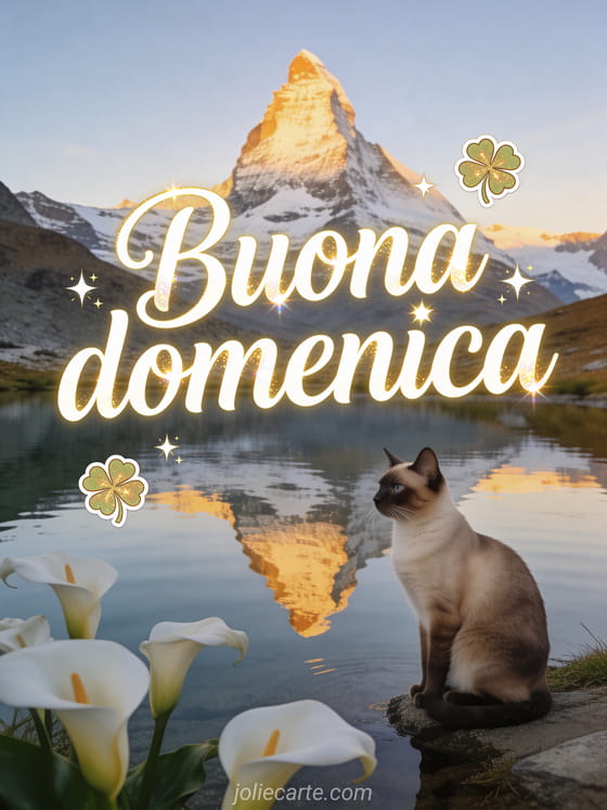 Invia una cartolina serena di domenica con calligrafia crema, riflessi dorati, quadrifogli e stelle luminose, il Cervino riflesso in un lago alpino cristallino, un gatto siamese elegante e calle bianche. Scopri anche buona domenica soleggiata gif, immagine di buona domenica o buona domenica in famiglia.