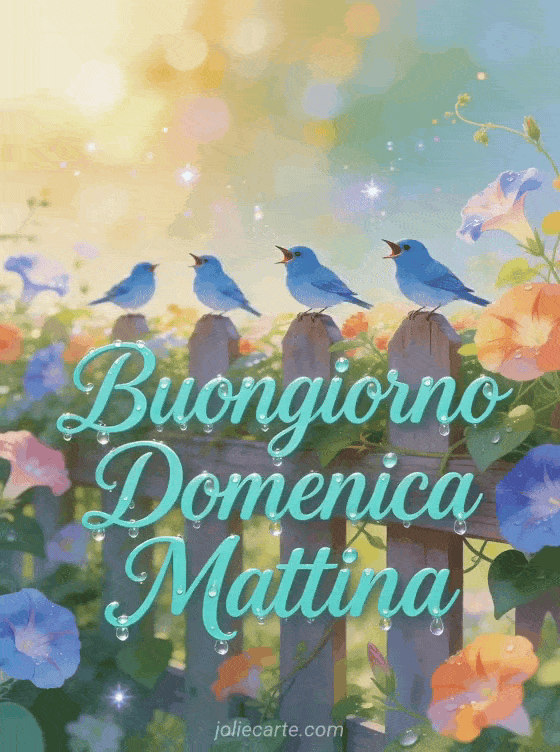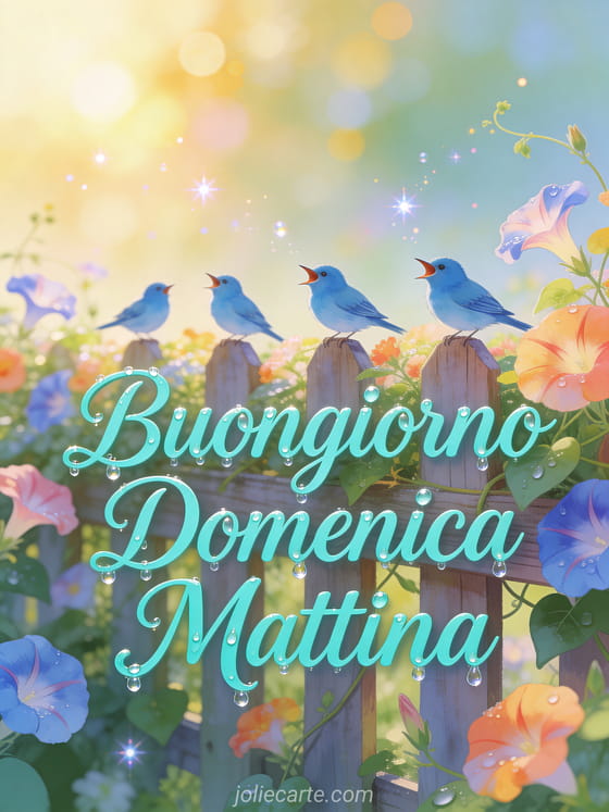 Invia un fresco saluto di buongiorno domenica mattina con uccelli che cantano su una staccionata con fiori all'alba. Un modo incantevole per iniziare la domenica di qualcuno. Scopri anche una cartolina buona domenica o una cartolina buona giornata domenica.