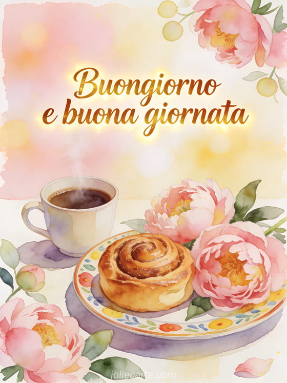 Condividi un'atmosfera dolce del mattino con una girella alla cannella accanto a una tazza di caffè fumante, peonie rigogliose e un piatto di ceramica allegro in una luce soffice ad acquerello. Puoi inviare anche buongiorno caffè gif caffè, una buongiorno caffè immagine o una buongiorno caffè fiori immagine.