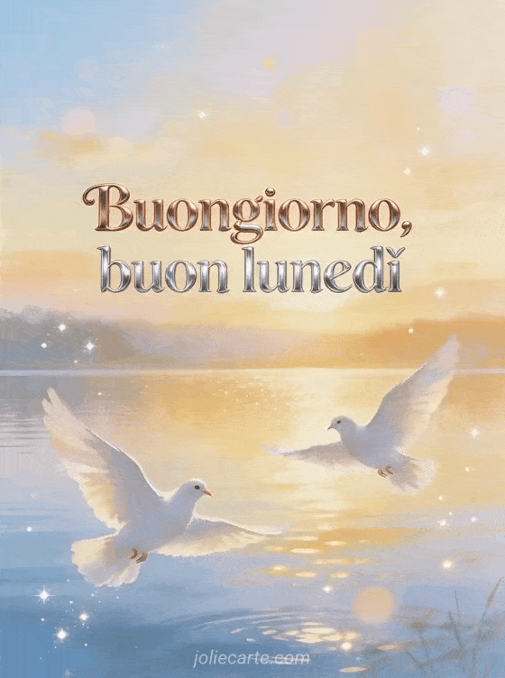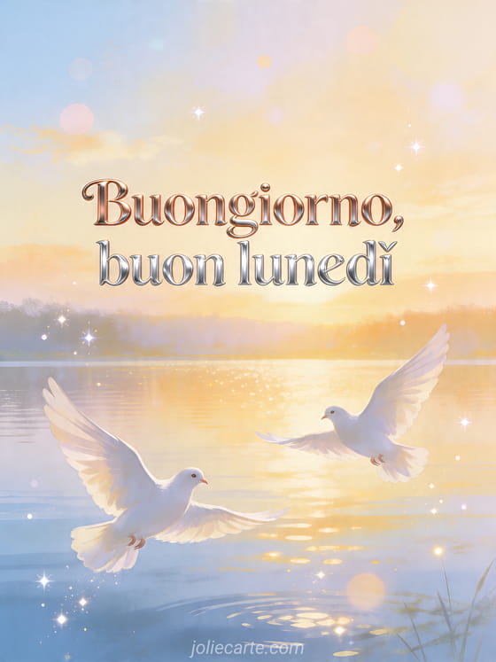 Invia un tranquillo biglietto di Buongiorno, buon lunedì con colombe bianche sopra un lago calmo all'alba. Scopri anche coraggio divertente buon lunedì, buongiorno lunedì e buon lunedì buona settimana divertente.