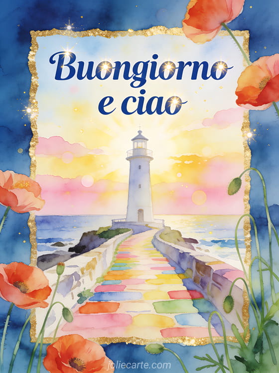 Condividi un ciao luminoso con questo biglietto ad acquerello, dove i petali di papavero incorniciano un faro bianco sopra un sentiero colorato sul mare. Scopri anche ciao buona mattinata, oh ciao o ciao baci del mattino.