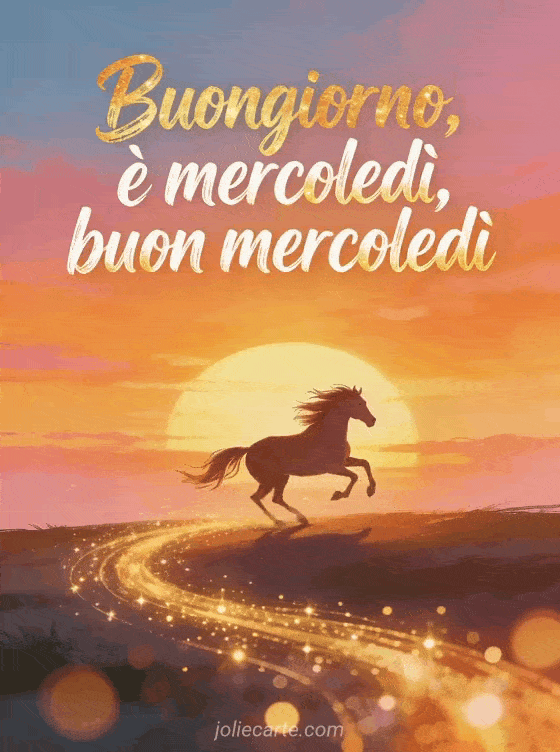 Condividi un saluto positivo del mercoledì con lettering a pennello caldo, cielo luminoso all'alba, un cavallo, scie scintillanti, bokeh pulito e colori vivaci. Scopri anche buon mercoledì animato, buon mercoledì montagna o immagini animate buon mercoledì.