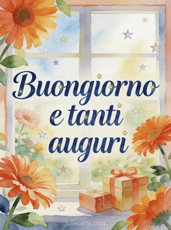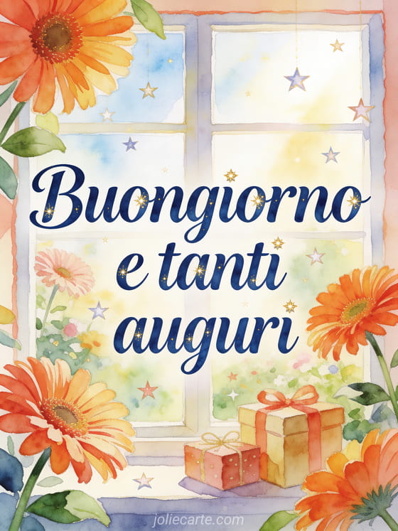 Invia una cartolina festiva di buongiorno con scritte eleganti blu profondo ad acquerello, gerbere luminose, pacchi regalo incartati e coriandoli a forma di stella in un giardino alla finestra. Scopri anche un piccolo messaggio per buongiorno, un messaggio di buongiorno al suo caro o una cartolina virtuale di buongiorno.