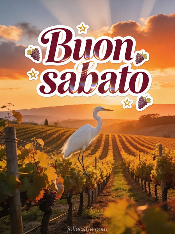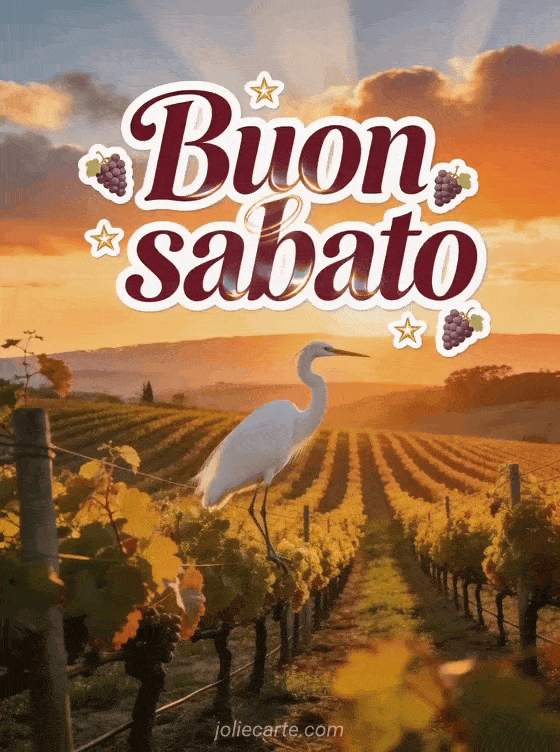 Invia un buon sabato caloroso con un vigneto della Napa Valley, filari dorati di viti, sticker di uva e una maestosa garzetta bianca che atterra nella luce arancione del tramonto. Scopri anche buon sabato amici gif, amicizia buon sabato buon weekend o buongiorno buon sabato baci.