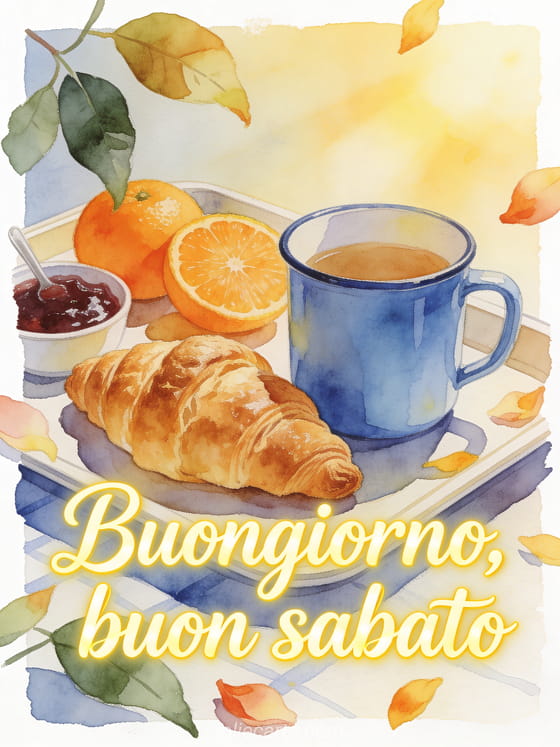 Condividi un saluto allegro del sabato mattina con un croissant sfogliato, una tazza smaltata blu, arance e marmellata su un vassoio da colazione in acquerello. Scopri anche buon sabato gif, immagine citazione buon sabato o bellissima immagine di buon sabato.