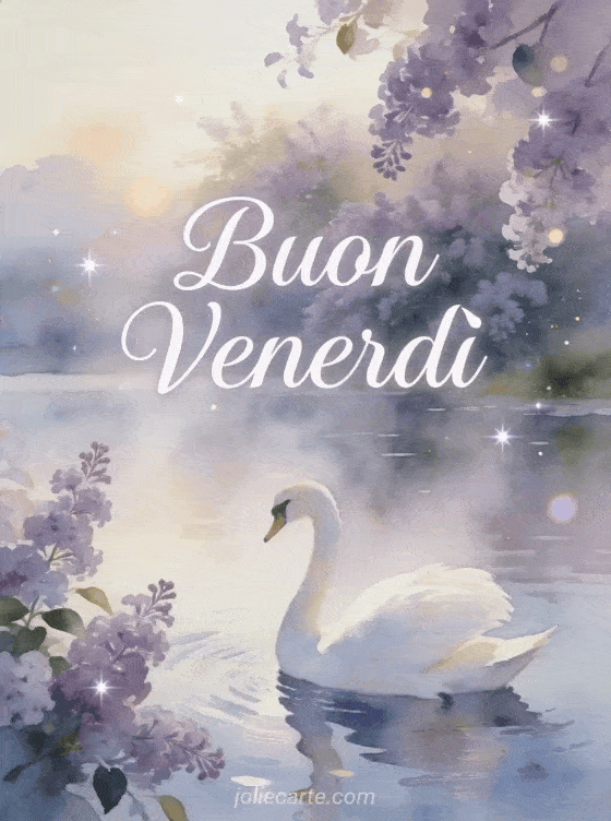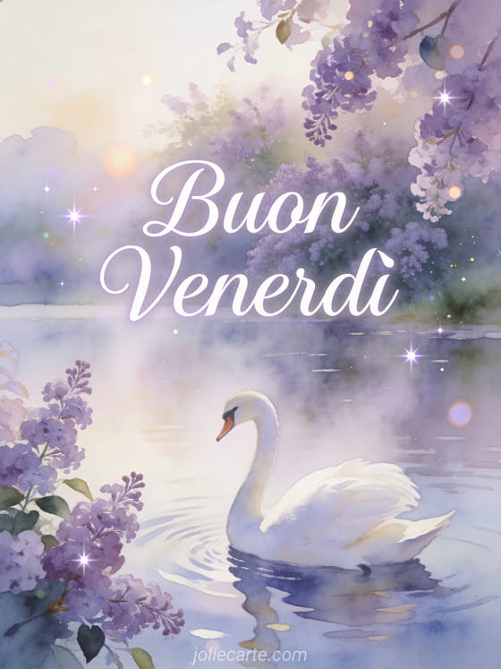 Inizia il venerdì in modo bellissimo con questa elegante cartolina con un grazioso cigno bianco che scivola su un lago nebbioso circondato da lillà in fiore. Scopri anche un gif buon venerdì o buon venerdì gif umorismo.