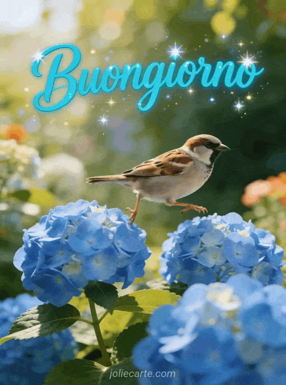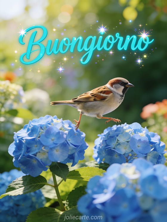 Invia un gioioso buongiorno gif con questa bellissima cartolina gratis. Un allegro passero che salta tra fiori di ortensia blu in una vivace scena mattutina di giardino, perfetta per un saluto dinamico e animato. Scopri anche una cartolina ciao come stai o una cartolina immagine buongiorno ottobre.