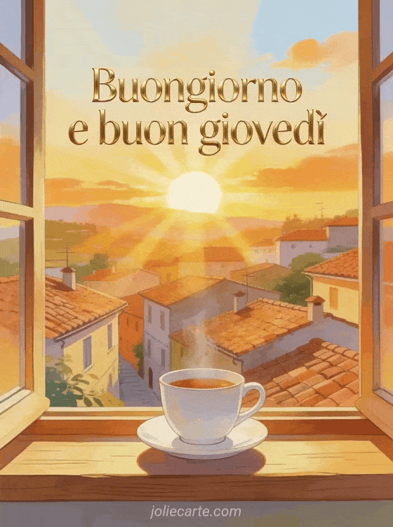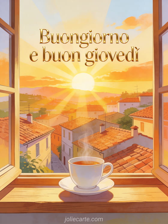 Condividi buongiorno e buon giovedì con scritta moderna elegante, luce dorata, alba sui tetti del villaggio, una tazza sul davanzale, raggi delicati e una palette vivace. Scopri anche immagini baci del giovedì, buon giovedì tanti baci gif o baci del giovedì gif.