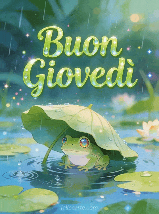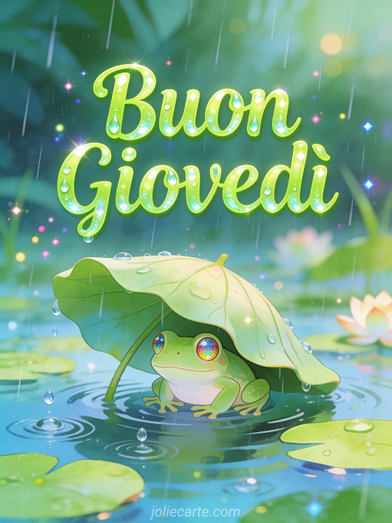 Invia questa magica cartolina di buongiorno giovedì piovoso con un piccolo ranocchio rifugiato sotto una foglia di loto nella pioggia. Scopri anche una cartolina buon giovedì grandi baci o una cartolina buon giovedì piovoso.