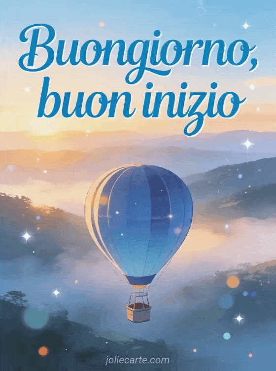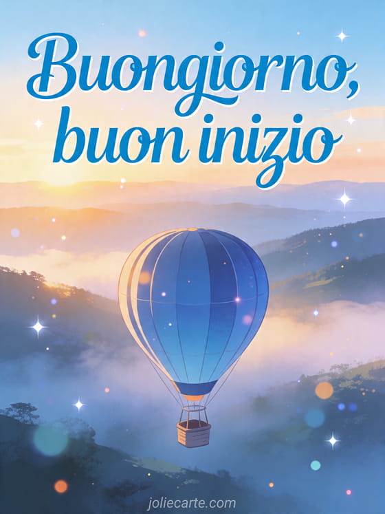Invia un biglietto di Buongiorno con una mongolfiera che sale sopra una valle nebbiosa per un inizio di settimana ispirante. Scopri anche divertente buon lunedì, buon lunedì mattina e buon lunedì buona settimana caffè.