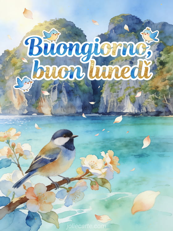 Invia un saluto luminoso di buongiorno e buon lunedì con lettere blu ad acquerello, tocchi dorati, uccellini allegri, petali sospesi, acque turchesi di Phi Phi e un ciuffolotto su un ramo fiorito. Puoi vedere anche questo buon lunedì buona settimana gif, questa buon lunedì caffè immagine o questa buon lunedì buongiorno buona settimana.