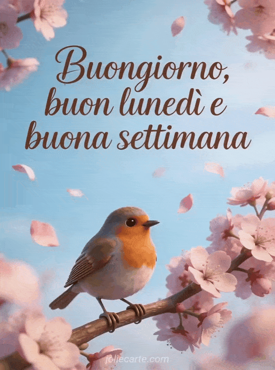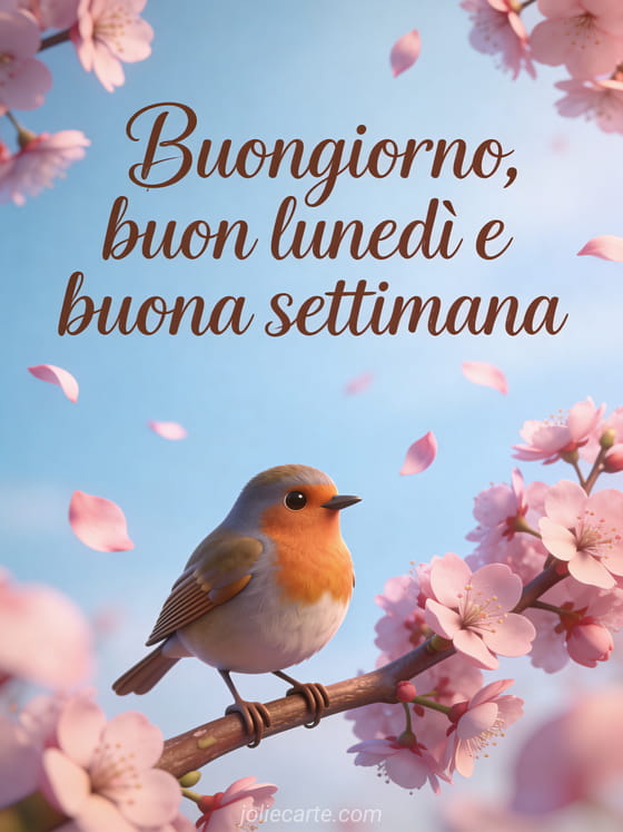 Invia calorosi auguri di buongiorno, buon lunedì e buona settimana con questa poetica cartolina con un pettirosso su un ramo di ciliegio in fiore. Scopri anche bella cartolina buon lunedì o buona serata di lunedì.