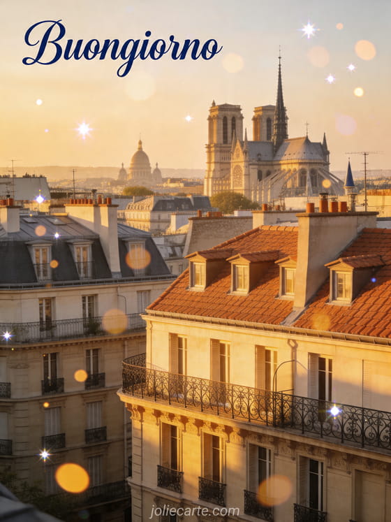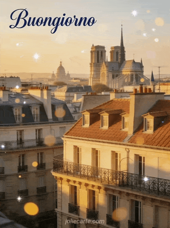 Invia un elegante biglietto di Buongiorno con i tetti di Parigi nella luce dorata per un lunedì raffinato. Scopri anche buon lunedì buona settimana divertente, buongiorno buon lunedì e buon lunedì immagine.