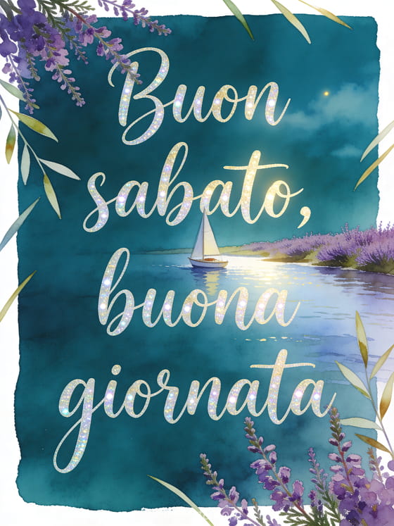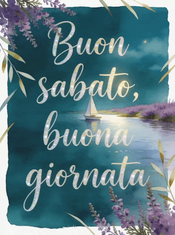 Condividi un'immagine di buongiorno sabato con scritte verde petrolio, una piccola barca a vela vicino alla riva del fiume e rametti di erica viola che attraversano il bordo. Puoi inviare anche buon sabato cartoline virtuali, buon sabato tanti baci gif o un'immagine gratis buongiorno sabato.