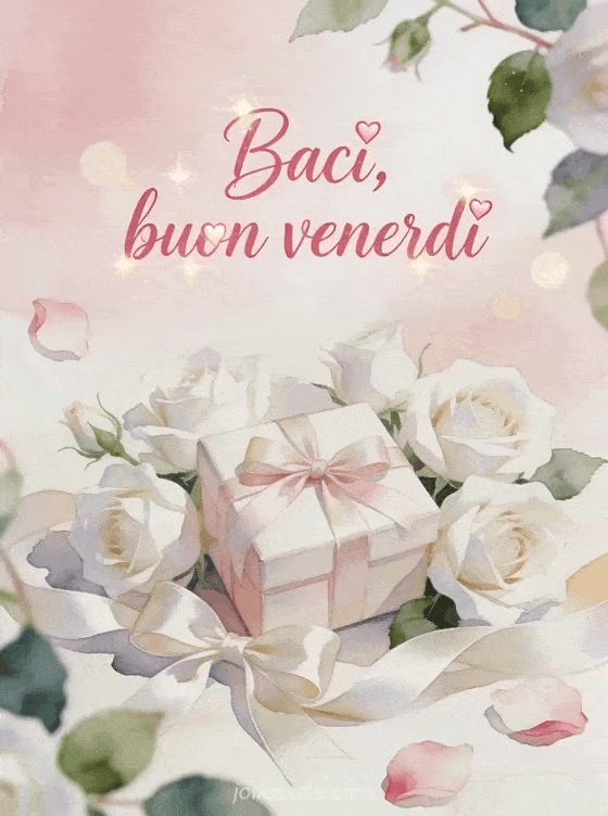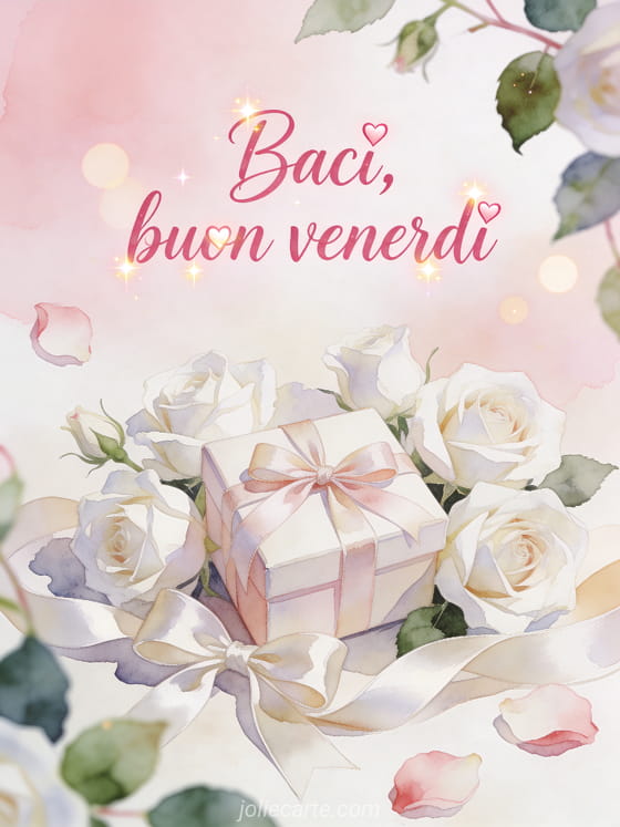 Condividi baci e buon venerdì con un biglietto ad acquerello che mostra una piccola scatola regalo legata con nastro tra rose bianche, fiocchi di raso e bagliori a forma di cuore. Scopri anche un biglietto di buon venerdì caffè gif, buon venerdì immagini e gif o buon venerdì e buon weekend immagini.