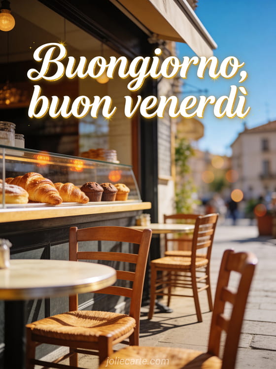 Invia un saluto realistico di buongiorno e buon venerdì con elegante calligrafia bianca, riflessi dorati, un luminoso caffè di strada con sedie vuote, paste calde, bokeh morbido e cielo blu sereno. Puoi vedere anche questa cartolina animata buon venerdì, questo buon venerdì divertente umorismo o queste buon venerdì fiori immagini.