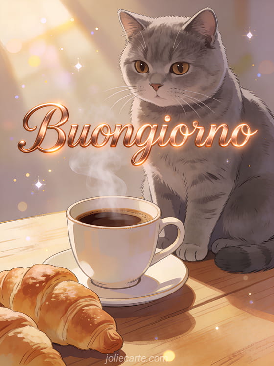 Condividi un saluto caldo di buongiorno con scritta color rame, un grazioso gatto british shorthair grigio accanto a una tazza di caffè fumante su un tavolo di legno, luce del mattino e croissant. Scopri anche un biglietto buon venerdì mattina con caffè, un biglietto buongiorno del venerdì con umorismo o un biglietto buongiorno venerdì paesaggio.