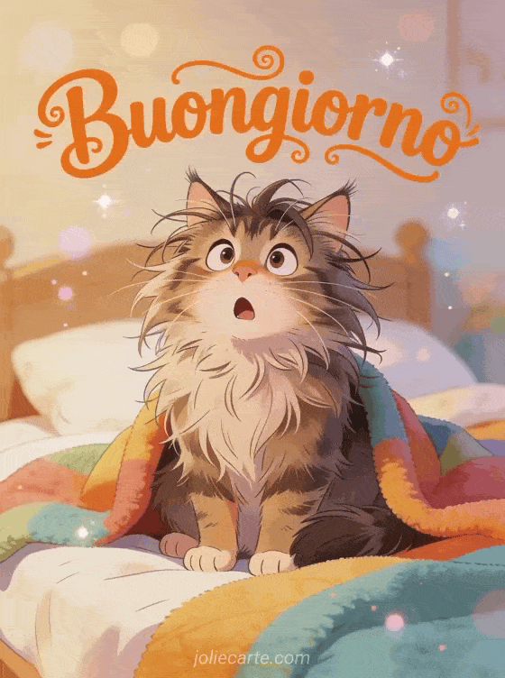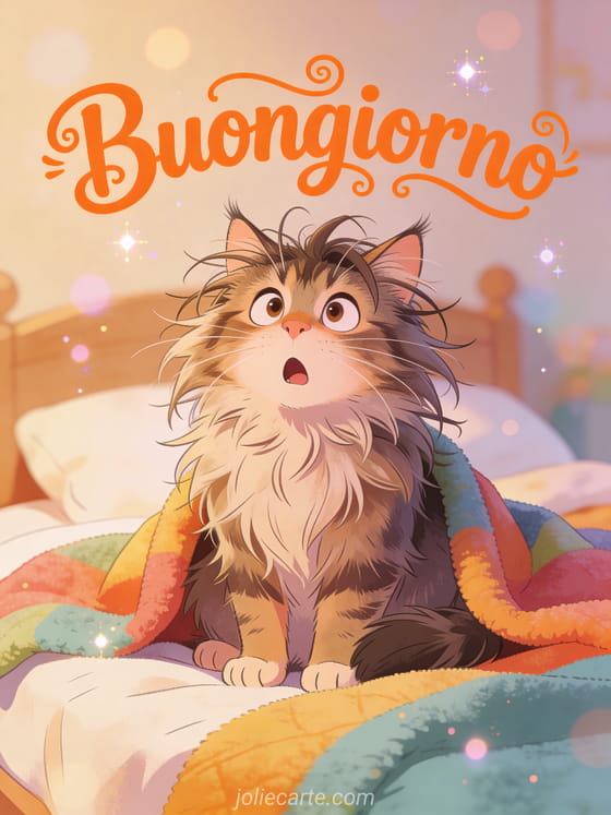 Condividi un saluto giocoso di buongiorno con scritta arancione saltellante, un gatto Maine Coon soffice con pelo spettinato e espressione sorpresa in un letto accogliente con coperte colorate. Scopri anche una gif paesaggio di buon venerdì, un biglietto buona giornata di venerdì con baci o una immagine buongiorno venerdì.