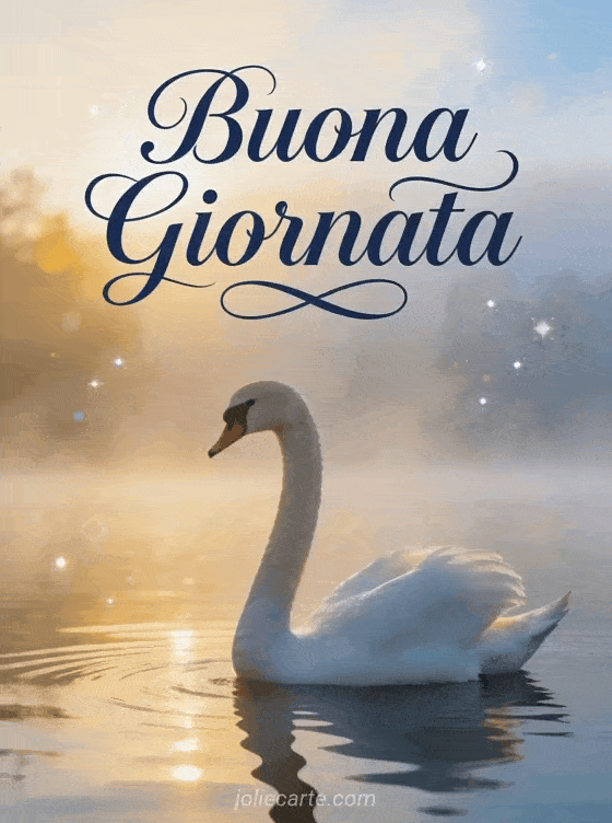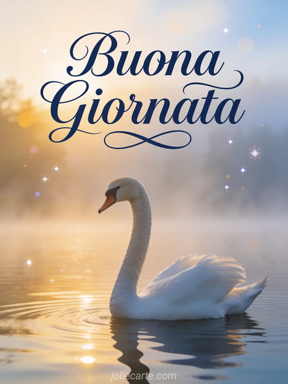 Buongiorno vi auguro una buona giornata una elegante cartolina di buongiorno con un cigno bianco che scivola su un lago tranquilo e nebbioso