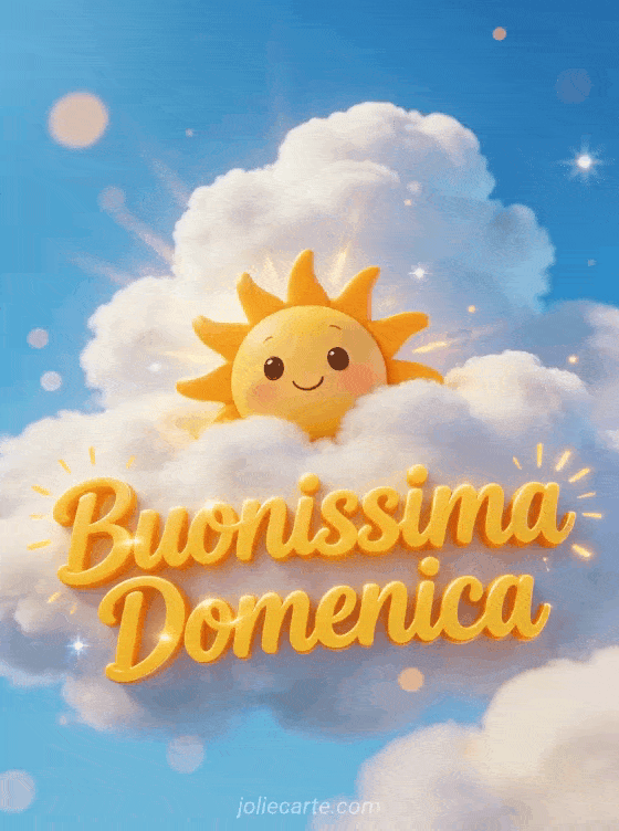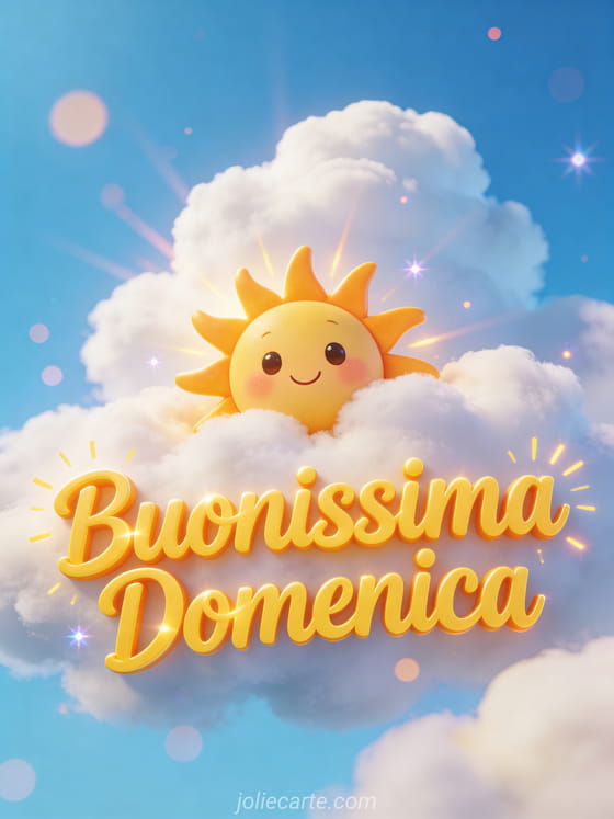 Illumina la domenica di qualcuno con questa allegra cartolina con un simpatico sole dei cartoni con faccina che spunta tra soffici nuvole. Scopri anche una cartolina buongiorno domenica umorismo, una cartolina tenerezza buona domenica baci o una cartolina buongiorno domenica mattina.