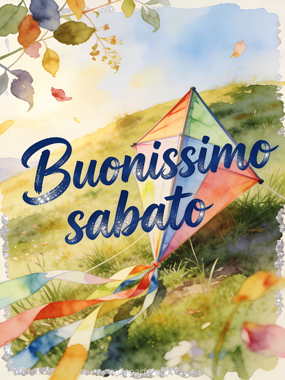 Porta energia del weekend con un aquilone ad acquerello appoggiato a una collina erbosa, nastri al vento, foglie selvatiche, petali e chiara luce dorata. Scopri anche immagini gratis buon sabato e buon weekend, buon sabato e weekend immagine o buon sabato fiori immagini.