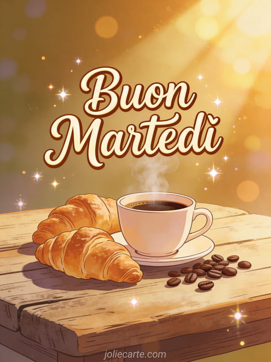 Inizia il martedì di qualcuno con calore e sole con questa accogliente cartolina con caffè fumante e croissant fresco nella luce dorata del mattino. Scopri anche una cartolina immagine buon martedì zen, una cartolina immagini buon martedì o una cartolina buon martedi a tutti.
