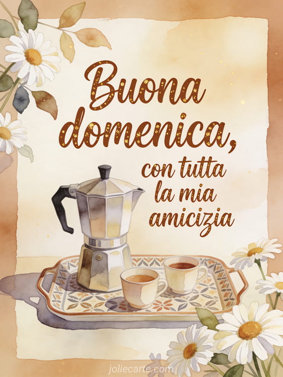 Condividi una buona domenica amichevole con una caffettiera moka, due tazzine, un vassoio da colazione decorato e margherite in calda luce ad acquerello. Puoi condividere anche buona domenica belle immagini animate, belle cartoline buona domenica o immagine per augurare buona domenica.