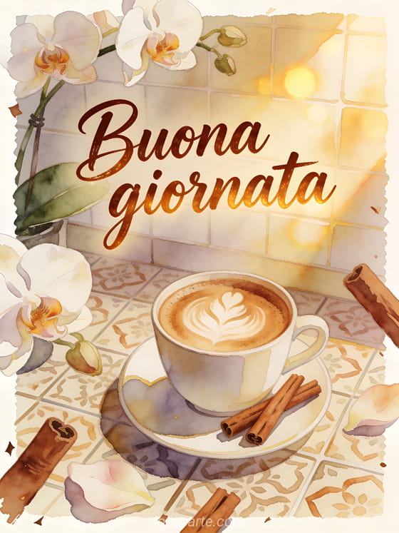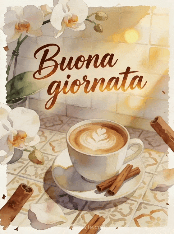 Augura una buona giornata con un angolo caffè accogliente, cappuccino, stecche di cannella, orchidee e luce calda ad acquerello. Scopri anche buona giornata gattino gif, buona giornata buongiorno spiaggia immagine o gif sole buona giornata.