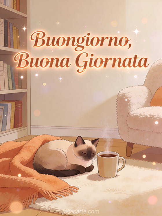 Augura a qualcuno una splendida giornata con questa accogliente cartolina di buongiorno con gatto siamese e caffè fumante. Scopri anche una cartolina buona giornata sotto il sole o una cartolina umorismo sole buongiorno.