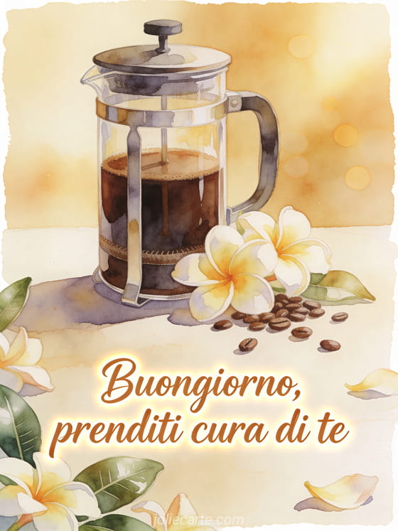 Offri un pensiero tranquillo del mattino con questo biglietto ad acquerello, con una french press di vetro, caffè intenso, petali di frangipane, foglie lucide e chicchi. Scopri anche buongiorno caffè gif, carina immagine buongiorno caffè o buongiorno buon caffè del mattino.
