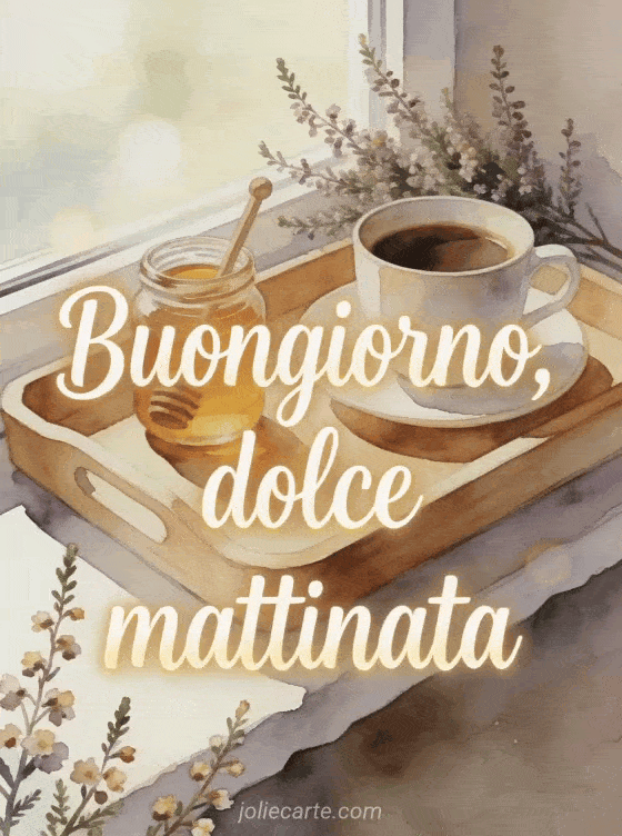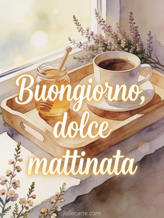 Inizia la mattina con calma grazie a scritte seppia ad acquerello, un vassoio da colazione, una tazza di caffè, un vasetto di miele, rametti di erica e luce ariosa dalla finestra. Scopri anche un biglietto immagine buongiorno caffè gratis, un biglietto caffè buongiorno caffè gif animata o un biglietto buongiorno caffè gif.