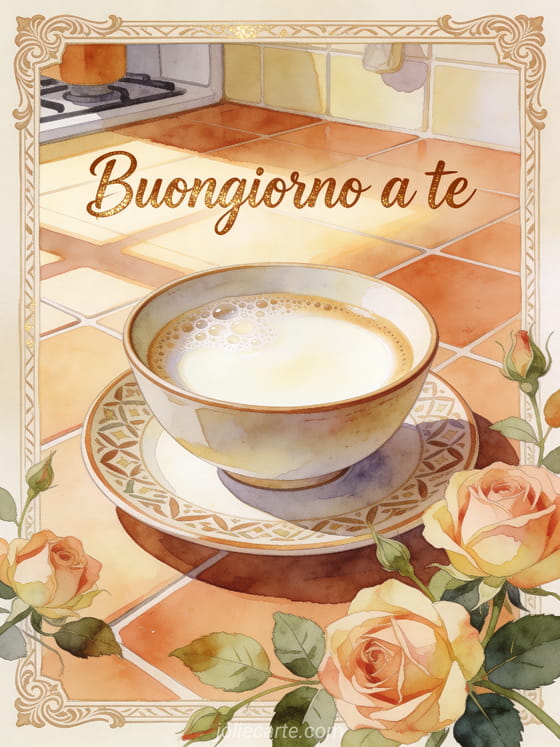 Invia caffellatte buongiorno con lettere marrone crema, rose antiche e una ciotola di caffellatte su un piattino decorato. Puoi condividere anche buongiorno e buon caffè immagine, sorriso buongiorno caffè o buongiorno buon caffè del mattino.
